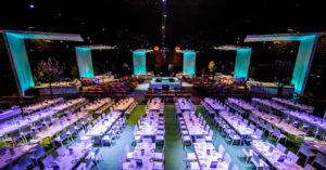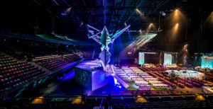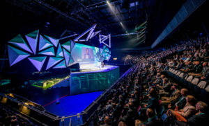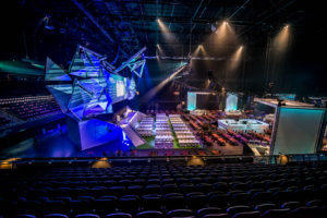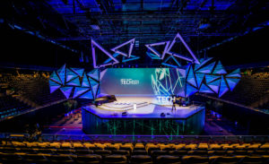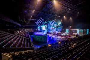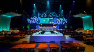 In collaboration with NEOC we created a double sided 18 meter widescreen. One side was for the day program and the other, exact copy, was for the award show during the evening. We used Barco HDX W20 flex projectors and a Modulo Pi media server. The Modulo has the capability of near zero latency capturing of live inputs so all camera feeds where managed by the Modulo server. Also we used our Powerpoint servers, vMix set and remote controlled timer software. Al was controlled by the modulo server so the complex show was operated by just 1 technician.